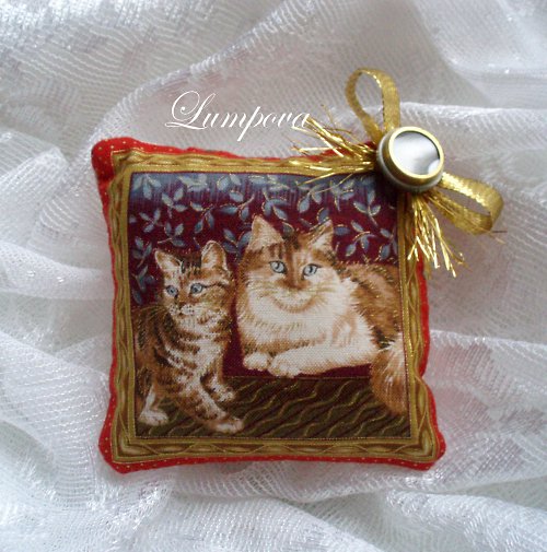 Jehelníček je ušitý ze 100% bavlny se zlatým tiskem, ozdobený zlatou stuhou a knoflíčkem, plněný dutým vláknem.