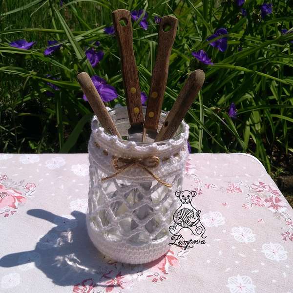 Ručně háčkovaný obal na skleničku, háčkovaná krajka dodá romantickou náladu k večerní náladě nebo ozdobí váš stůl. Malý dáreček, který potěší. Háčkovaný obal na skleničku je ze 100% bavlněné příze. Na přání lze dodat se skleničkou nebo bez.