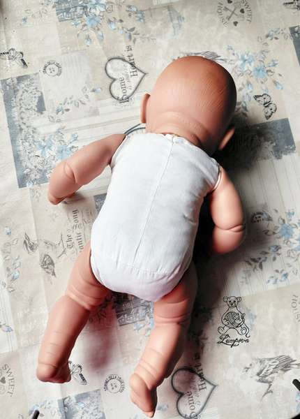 Miminko má hlavičku a končetiny z měkčeného vinylu, končetiny jsou k tělu připojeny klouby. Látkové měkké tělíčko, pohyblivé končetiny, v top stavu, vysoká 49-50cm,